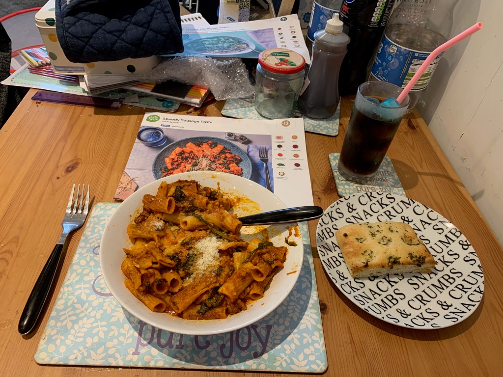 Lunchtime for me is at 1.30pm (my fellow colleagues tend to have different lunchtimes depending on when they start and finish). In this time, I do more washing up, put on another load of laundry (I hang that load up after I finish my volunteering) and eat my lunch. Sometimes I make a sandwich from scratch, sometimes I have leftovers of a meal from the day before. I also relax on my couch until I resume my volunteering at 2.30pm.