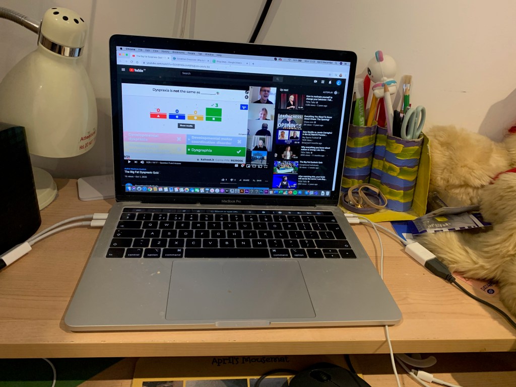 Next, I log onto my MacBook Pro sometime before 11am and check in with my colleagues through the Skype messenger chat feature (I also message them when I go for lunch, return from lunch and finish for the day). The first thing I do for Exceptional Individuals is share some neurodiversity-related articles that I get by e-mail from Google Alerts onto the agency’s relevant groups for autism, dyslexia and dyspraxia (because there is no dedicated ADHD group by my agency, I share any ADHD-related articles to the agency’s main Facebook page). I then do some YouTube-based work such as adding chapters and extra information to the description of the previous week’s Zoom webinar on a Monday. I take part in the occasional webinar on a Thursday. Sometimes I even watch YouTube videos or Netflix shows if they are relevant to what I am working on. For example, I once watched Love on the Spectrum because one of my colleagues asked me to watch it so that I could write a blog post post about it.