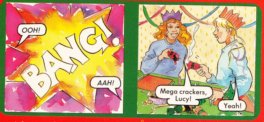 The first panel of the third strip is only an explosion, but the second panel reveals that Liz and Lucy had pulled a mega cracker.