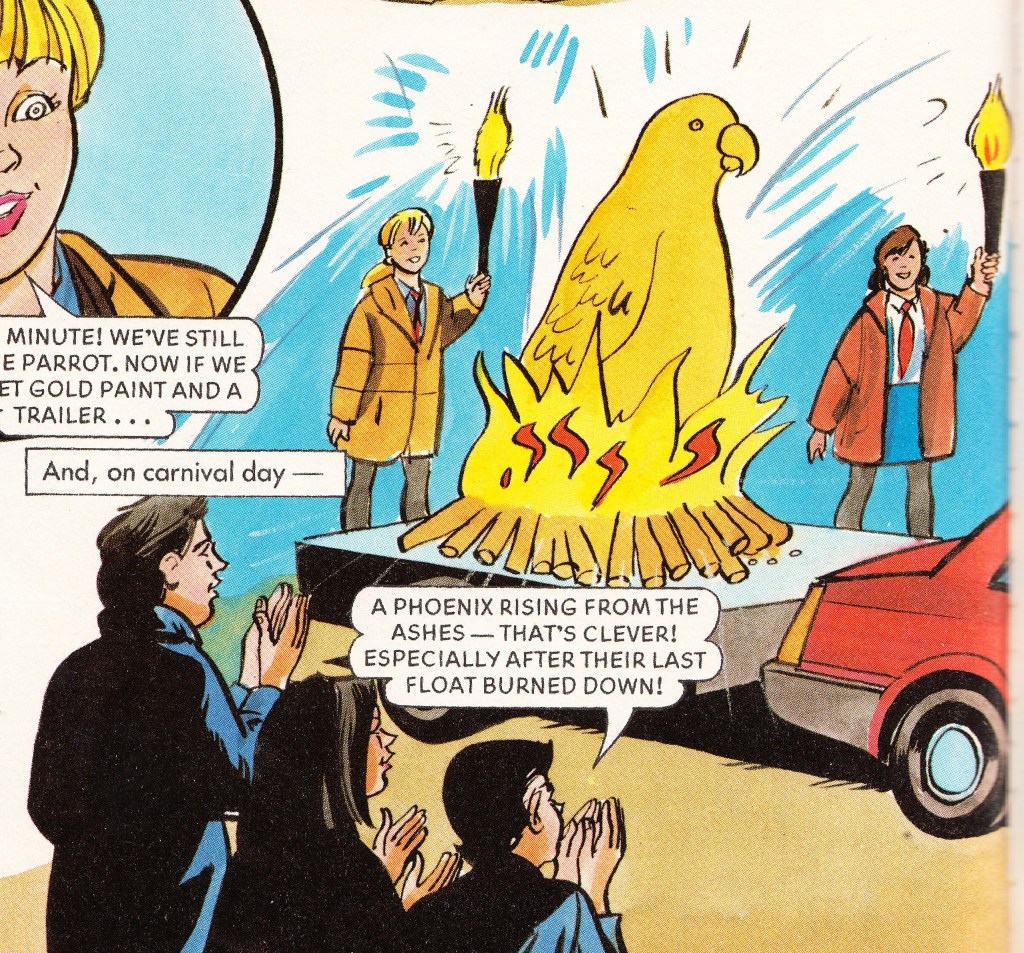 In this second instalment of The Comp in this annual, the pupils of Redvale Comprehensive School enter a float for the local Torchlit Winter Carnival. Laura draws up a design of a pirate ship with a parrot and her idea is chosen for the school’s float. Miss Grimstyle advises everyone that their float idea must be kept a secret. During the construction of the float, the Redvale pupils suspect that some pupils from St. Angela’s Girls’ School are listening in on them about their float idea. The St. Angela’s pupils tell the Redvale snobs, Pippa and Morag, that they will pay them £5.00 each if they tell them what the float is going to be. When Pippa and Morag enter the shed where the float is being built, they turn on the faulty light where its sparks cause the float to catch fire. This leads Pippa and Morag to tell the St. Angela’s girls that Redvale Comp will no longer be entering the float, but the St. Angela’s girls refuse to pay them because they heard about the fire on the news. Despite the pirate ship burning down, Laura realises that she and her fellow pupils still have the parrot, so they turn it into a phoenix rising from the ashes for their final float idea. The Redvale Comp pupils win the float competition and the St. Angela’s girls push Pippa and Morag into the fountain for lying to them about the float.