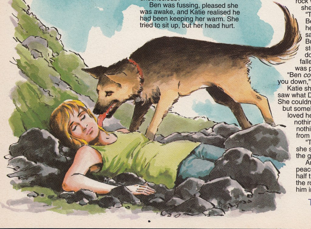 On the first day of the summer holidays, Katie dreams about floating on her back in a warm, blue sea. Suddenly, her dog Ben wakes her up by licking her face. Katie, her mum and Ben go for a picnic on Redmond Hill, but this is ruined when the rain starts to fall. As Katie, her mum and Ben descend the hill, a landslide begins. As the rocks fall, Ben tries to push Katie out of the way, but she loses her footing and becomes unconscious. In her unconscious state, Katie thinks that Ben is still with her. When Katie comes around, her parents find her, but she can no longer see Ben. Her parents take her to the hospital where the doctor orders her to rest for a day or two, but she is unable to rest because Ben is not at home. Katie and her parents return to Redmond Hill to look for Ben only to find him lying beneath the rocks that had killed him in the landslide. Katie is devastated by Ben’s death because she believes that he had saved her life.