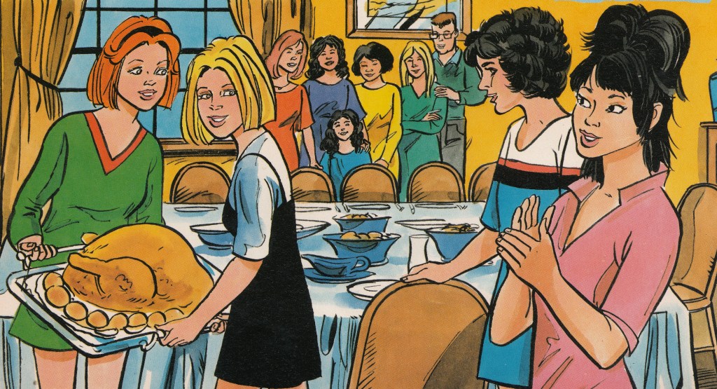 In this instalment of Carly’s Crowd!, Carly tells readers that the fourth Thursday in November is Thanksgiving in America and she reminisces the previous year’s Thanksgiving. Carly wanted to invite her whole crowd over for Thanksgiving, but Marie Gomez couldn’t come because a lot of her relatives from Mexico City were planning to visit her. Carly’s mum gave Carly and the rest of her crowd the job of defrosting all the food for the Thanksgiving dinner. They thought they had defrosted everything until Carly’s mum told them they forgot to defrost the turkey. Marie then phoned Carly to let her know her relatives from Mexico City couldn’t make it because their flight was cancelled, so she invited Carly and the rest of the crowd to her house for Thanksgiving dinner instead.